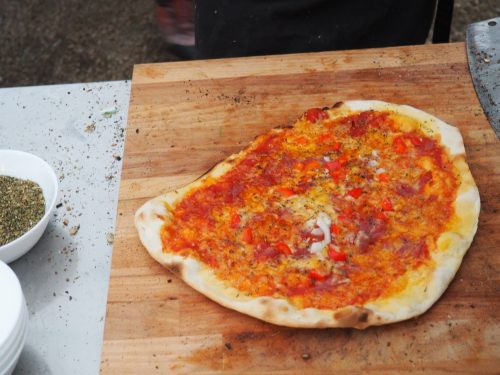 Trotz des regenreichen Tages wurde Holz gesägt, gespalten, aufgeschichtet und mit bloßen Händen Pizzateig geknetet. Umso köstlicher schmeckte nacher die Pizza aus dem Holzbackofen. Das große Feuer brannte trotzdem in voller Kraft und alle durchnässten Helfer/-innen waren nach kurzer Zeit wieder trocken.